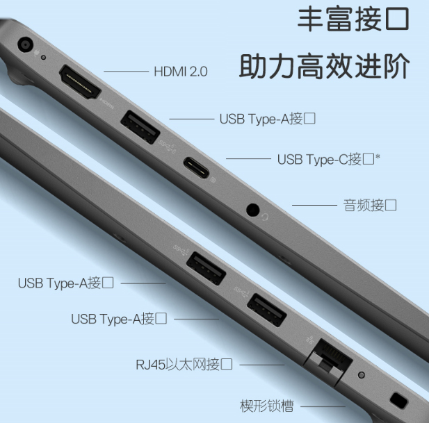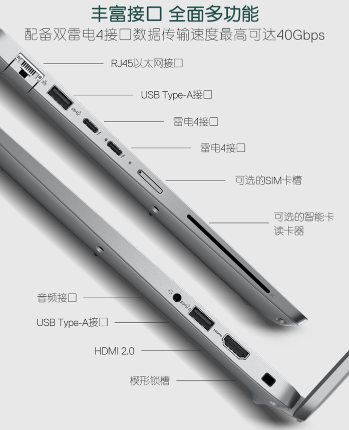 而在接口(功能与扩展)方面,虽不及Latitude 5X40系列有两个雷电4口那么豪华,但多至3个5Gbps USB大口(14、15英寸),加上带DisplayPort视频输出功能的Type-C口,以及HDMI2.0口,也让该系列在实用性和扩展性上实现了完美的兼顾。