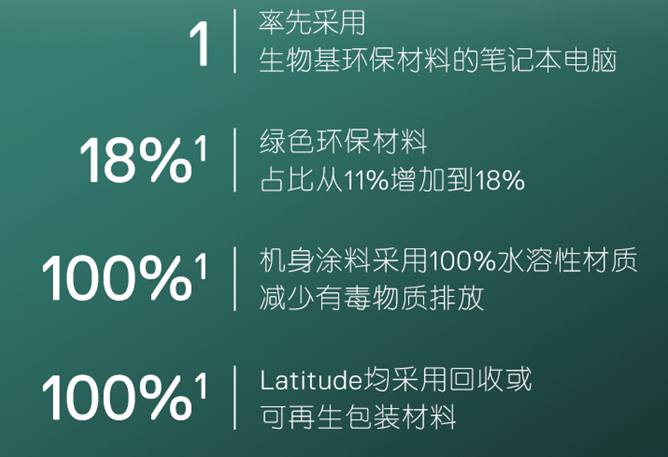 看到这里,相信大家已经知道Latitude 5X40是核心性能强大、功能体验丰富、扩展性强的电脑。实际上,Latitude 5X40还是非常绿色环保的电脑,它们在设计中使用五种不同的可持续材料,包含海洋回收塑料、蓖麻油、可回收碳纤维、回收油和纸张浮油(Tall Oil)。其整体绿色环保材料占比提升到18%,且机身涂料采用100%水溶性材质,而包装材料也全面采用可回收和再生材料——作为全球领先的IT厂商,戴尔毫无保留地践行着自己对环保的承诺。
