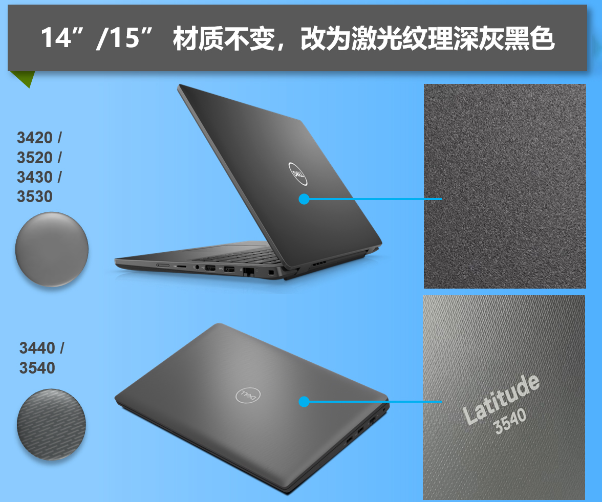 而可选二合一款型的Lati 3340与同系列的14、15英寸机型也很容易区分:其沿用上一Lati 3330的银灰色塑料外壳;而14/15英寸的Lati 3440/3540虽然外壳材质未变,但表面工艺(喷涂)变为激光蚀刻纹理的深灰黑色。