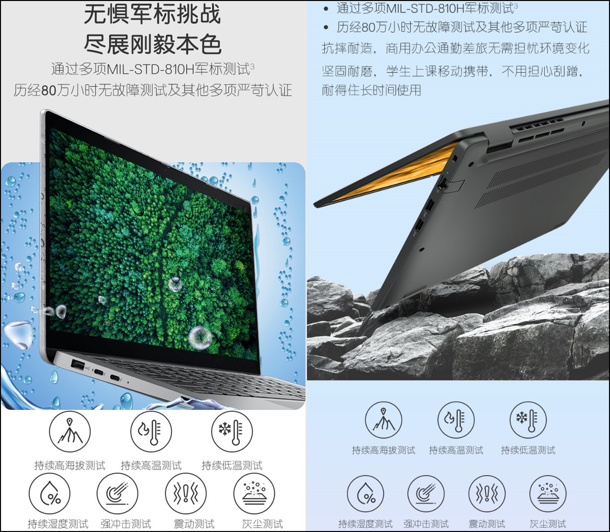 其实,这三个点,是所有Latitude商用本的“基本功”,也是它们的“共性”。比如:它们都通过了MIL-STD-810H军标测试,能够在高海拔、极寒极热温度,以及较高的湿度下正常工作,且在一定程度上抗摔、耐尘。