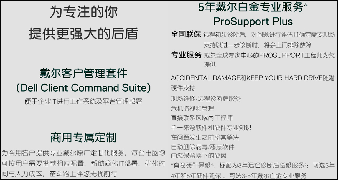 另外,戴尔还为它们提供强大的商用定制服务,包含配置定制、软件部署、设置及权限定制等;另外,用户还可选高达5年的白金专业服务,彻底告别使用中的问题和故障烦恼。