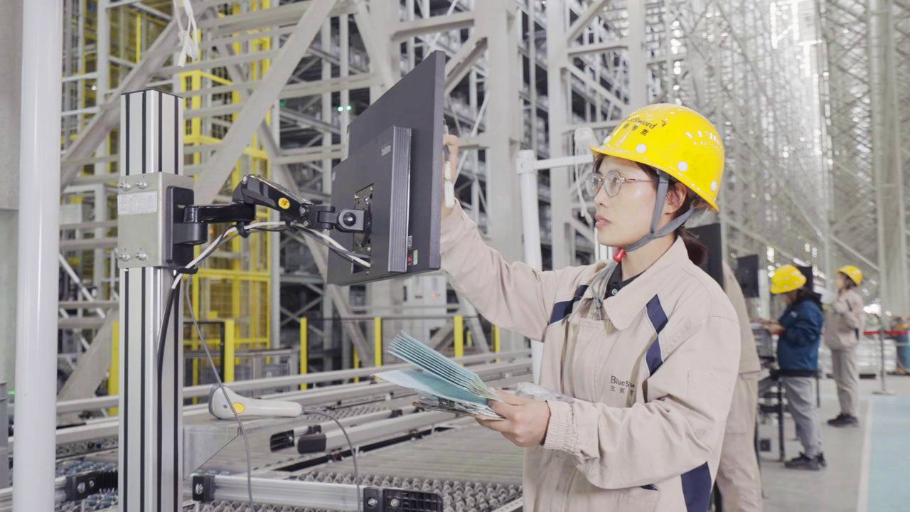 在工厂的超级物流中心里,有的工作人员会通过联想M大师塔式机来控制各种物流自动化系统。有的工作人员会通过由塔式机控制的大屏幕,了解智能仓库的库存情况、设备运行情况。