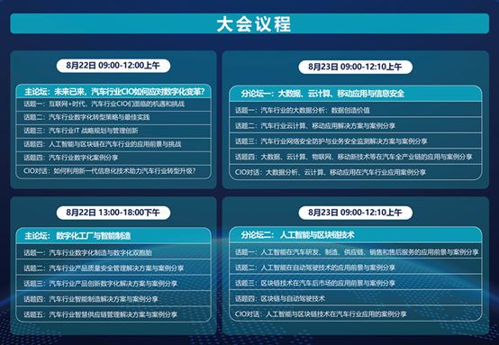 作为中国汽车行业首选信息化沟通交流盛会,“中国汽车CIO峰会”关注新一代汽车产业以及智能技术发展,在绿色出行的背景下,将涵盖商用车、乘用车、新能源汽车等整车企业、核心零部件企业,全方位展示汽车产业信息化现状。