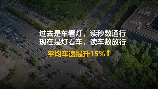 今年6月份以来,深圳交警选择华为云,在坂田9个路口做测试,就是用人工智能的技术,根据交通拥堵状况,实时调整交通灯控制策略。简单一句话就是,过去是车看灯,读秒数通行,现在是灯看车,读车数放行。结果是平均车速提升了15%,员工最大的感受是早上可以晚十分钟出门。大家看看屏幕上这张图片,是早上8点多拍的,按经验这个时间点应该是最堵的,但现在已经很难看到黑压压的堵车场面。现在我们也在把这个技术和北京、上海等地合作,希望给大家带来更好的出行体验。