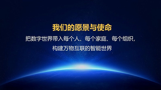 2006年,我们给自己提出的首个愿景是,丰富人们的沟通和生活。2014年,我们提出要共建全联接世界。去年底,我们提出新的愿景,把数字世界带入每个人、每个家庭、每个组织,构建万物互联的智能世界。我们当前的现实目标就是,要为智能世界铺上云的跑道,装上智能发动机,让大家更快、更好、更安全地拥抱智能世界。