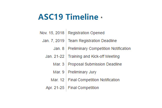 ASC19继续采用“初赛+决赛”的赛制。2018年11月15日到2019年1月7日为高校报名阶段,以小组形式报名,每个参赛队伍由五名本科生和一名指导老师组成。2019年1-3月为初赛阶段,参赛队根据要求提交超算应用优化提案,组委会筛选出二十支队伍进入决赛。决赛将于4月21-25日在大连理工大学举行,参赛队基于大赛提供的硬件平台,在3000W功率下设计和搭建超算集群并实现指定应用的优化。