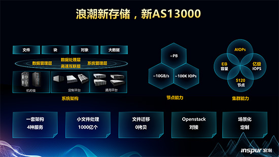 浪潮存储很早就看到了云计算、大数据和人工智能对大规模存储的需求,并启动了在软件定义存储方面的布局与投入,并通过Scale-out架构基础上不断进行技术创新和产品迭代,推出了自己的软件定义存储产品AS13000,并在一套架构下实现了文件、块、对象和大数据四种数据服务。