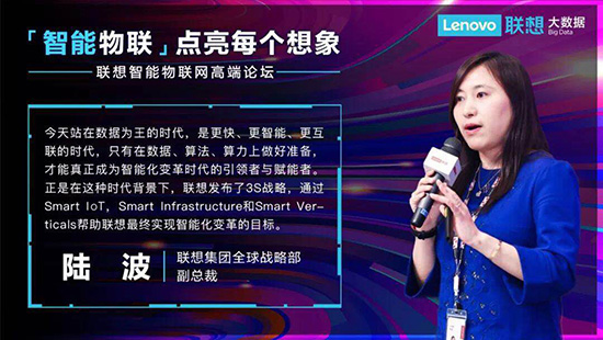 论坛上,联想集团全球战略部副总裁陆波对3S战略进行了全面解读。在谈到3S战略成立的背景时,她表示,数据为王的时代是更快、更智能、更互联的时代,只有在数据、算法、算力上做好准备,才能真正成为智能化变革的引领者与赋能者。正是在这种时代背景下,联想发布了以智能物联网(Smart IoT)、智能基础架构(Smart Infrastructure)和行业智能(Smart Verticals)为核心的3S战略,助力联想实现智能化转型的目标。