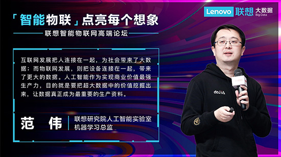 联想一直致力于人工智能技术的研发与应用,那么联想的人工智能究竟如何帮助智能物联网战略落地,打造联想业务差异性?来自联想研究院人工智能实验室的机器学习总监范伟认为,人工智能是智能物联网的核心技术之一。互联网发展把人连接在一起,为社会带来了大数据;而物联网发展,则把设备连接在一起,带来了更大的数据。人工智能作为实现商业价值最强生产力,目的就是要把超大数据中的价值挖掘出来,让数据真正成为最重要的生产资料。