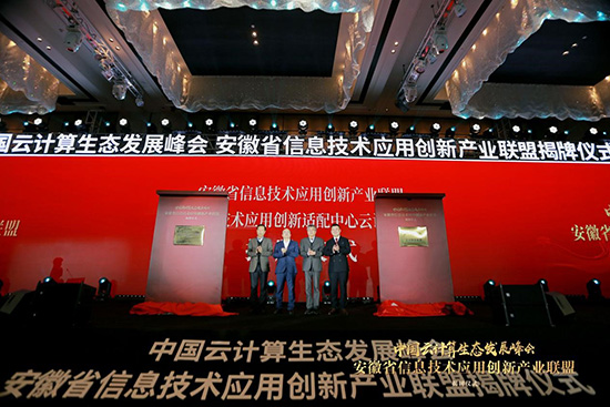 【国家工信部信软司副司长董大健、安徽省经信厅副厅长王厚亮上台共同为安徽省信息技术应用创新产业联盟揭牌;合肥市副市长王文松,华云数据董事长、总裁许广彬上台共同为安徽信息技术应用创新适配中心云计算实验室揭牌】