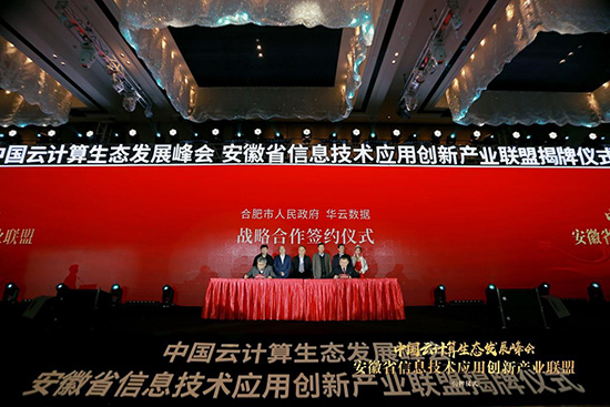 【在中国工程院院士沈昌祥,国家工信部信软司副司长董大健、国家工业信息安全发展研究中心副主任李新社、中国电子学会副秘书长洪京一,安徽省经信厅副厅长王厚亮的见证下;合肥市副市长王文松与华云数据董事长、总裁许广彬上台进行“合肥市政府与华云数据战略签约仪式”】