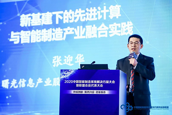 在主论坛供应商代表分享环节,中科曙光副总裁张迎华以《新基建下的先进计算与智能制造产业融合实践》为题发表主旨演讲。