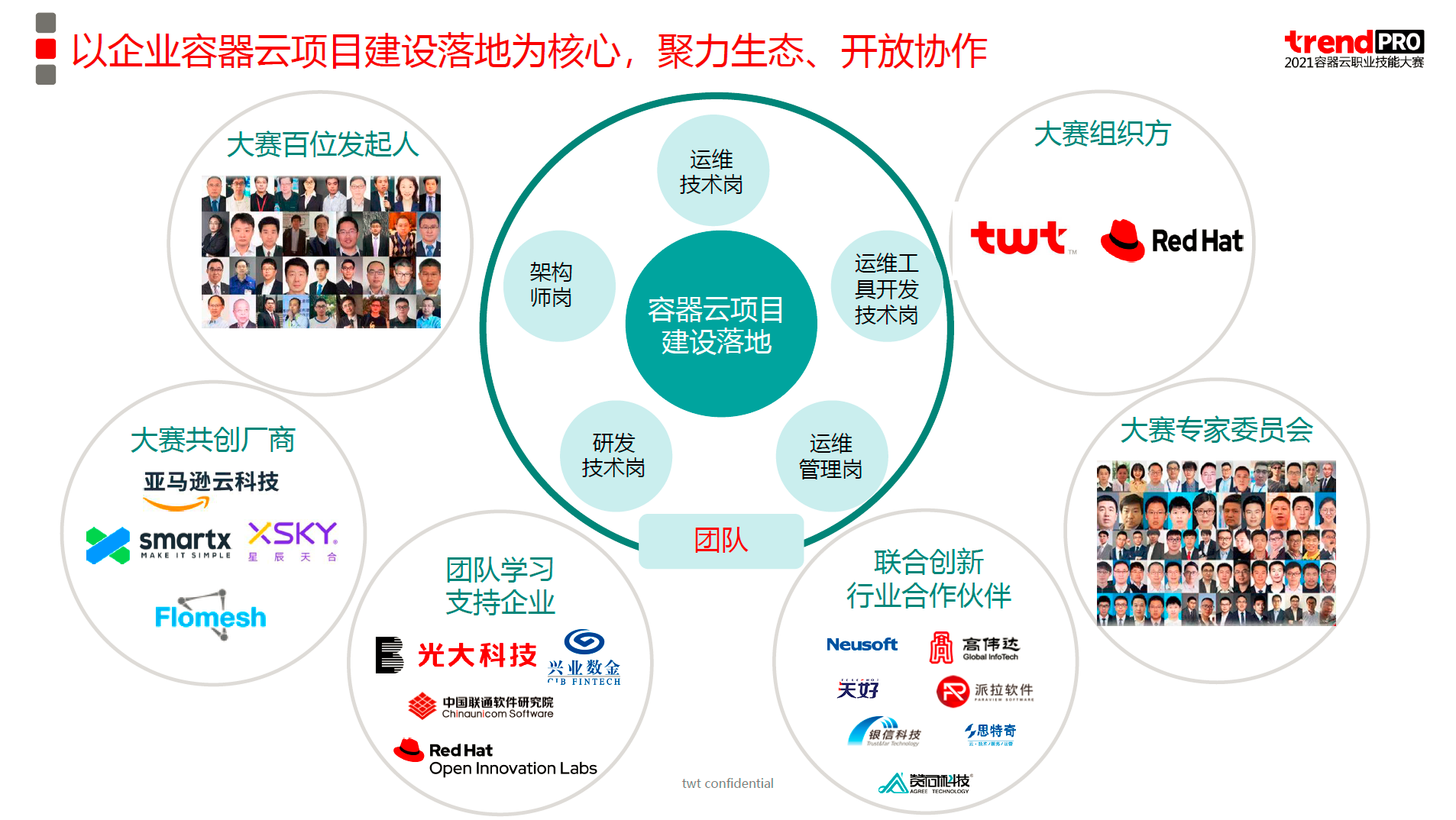 日前,由上百位行业领先企业IT管理精英发起,中国企业IT社区twt与红帽联合主办的2021容器云职业技能大赛正式拉开帷幕。本次大赛以“聚力变现容器价值”为主题,旨在以企业容器云项目建设落地为核心,聚力业界各方技术精英,推动形成行业创新解决方案和落地行业应用事实标准,助力更多企业运用容器云技术实现业务创新。