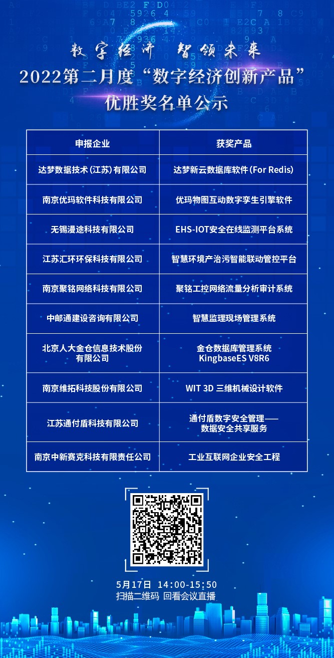 5月17日下午,2022第二月度“星光江苏”数字经济新品发布会作为系列活动的第三场发布会在线上成功举办。经组委会前期征集、线上投票、专家评审综合评分后,评选出达梦新云数据库软件(For Redis)、优玛物图互动数字孪生引擎软件、EHS-IOT安全在线监测平台系统、智慧环境产治污智能联动管控平台、聚铭工控网络流量分析审计系统、智慧监理现场管理系统、金仓数据库管理系统KingbaseES V8R6、WIT 3D 三维机械设计软件、通付盾数字安全管理-数据安全共享服务、工业互联网企业安全工程10个具有数字技术创新性、模式差异化、市场竞争力的创新产品,并分别在发布会上进行产品路演。