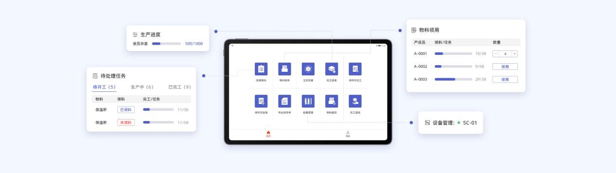 掌上工厂还支持作业指导书等工艺文件远程下发以及对生产过程的追溯,包括产品各工序信息追溯,材料耗用追溯以及质量追溯等;还可扫描设备二维码,查询设备保养信息及相关参数状态,实现生产设备管理信息化。而电子看板则通过大屏幕实时展示出生产进度、生产效率等,将生产过程可视化。