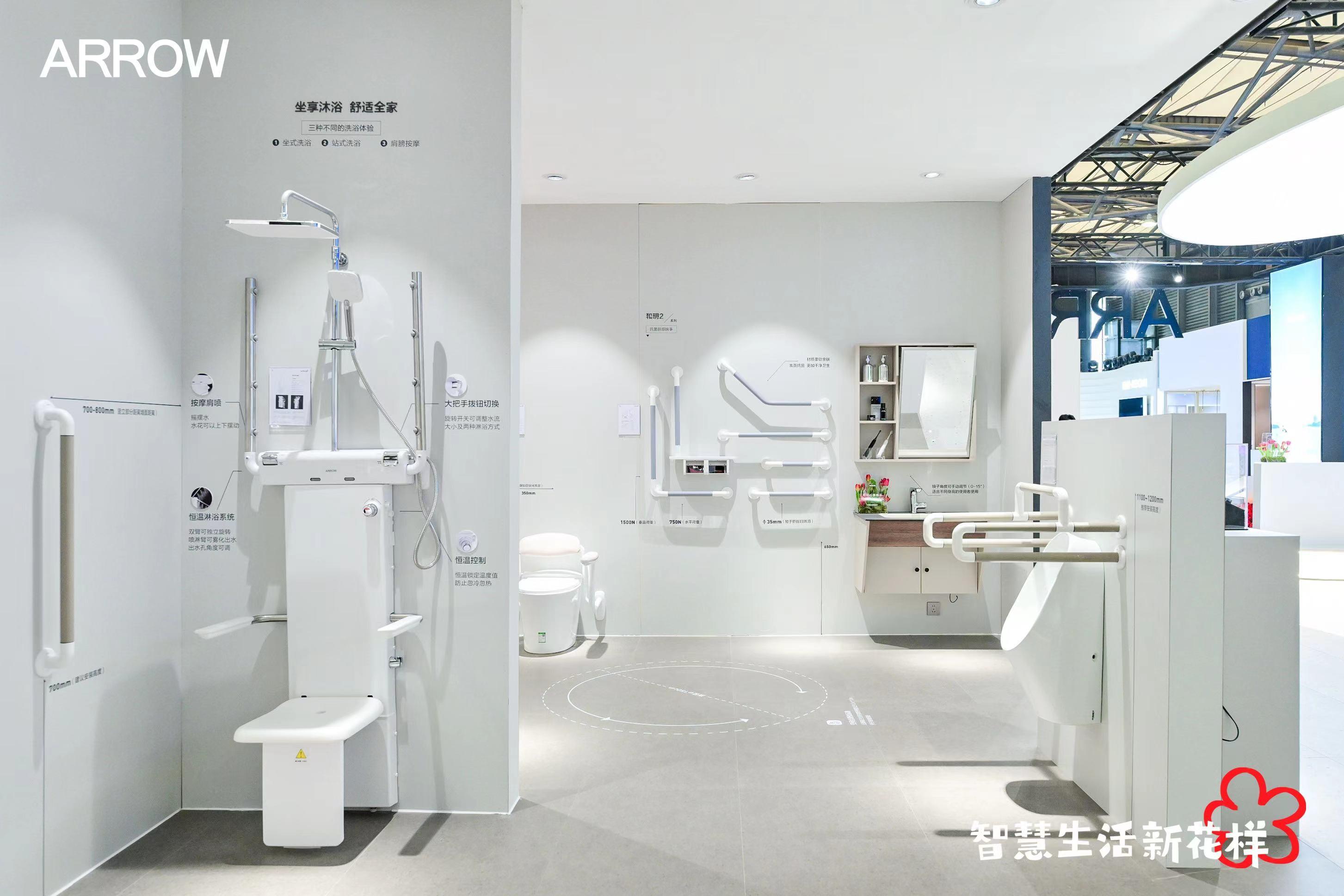 在智能康养时代,“和玥”无障碍康养浴室空间保障了安全、便利、舒适的适老化康养生活。其配套的坐便器扶手、智能升降助力器等适老化产品,能够关爱更多不同人群的美好智慧生活。