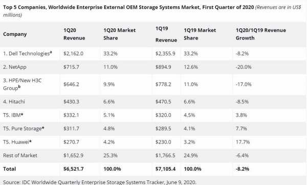 IDC:2020年一季度全球企业外部OEM存储系统市场收入下滑8.2%