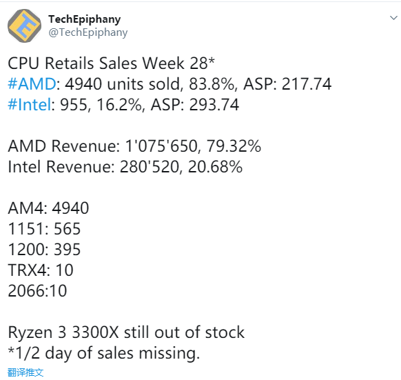 德国电商Mindfactory具体销量数字也是公布最为详实。根据最新数据,在刚刚过去的第28周,Mindfactory平台上一共卖出了5895颗消费级桌面处理器,其中AMD 4940颗,占比达83.8%,均价217.74欧元;Intel 955颗,占比为16.2%,均价293.74欧元。