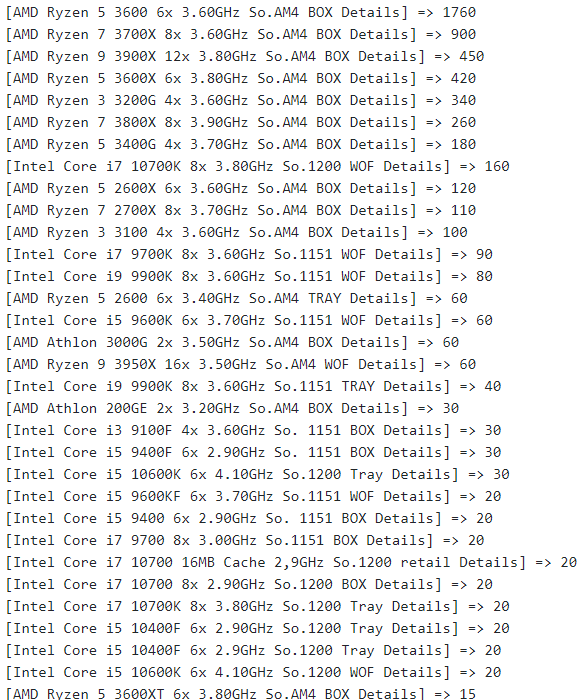 Intel方面最火的是最新的十代i7-10700K,但也只有160颗,之后几位都还是第九代,十代总共卖出300多颗。
