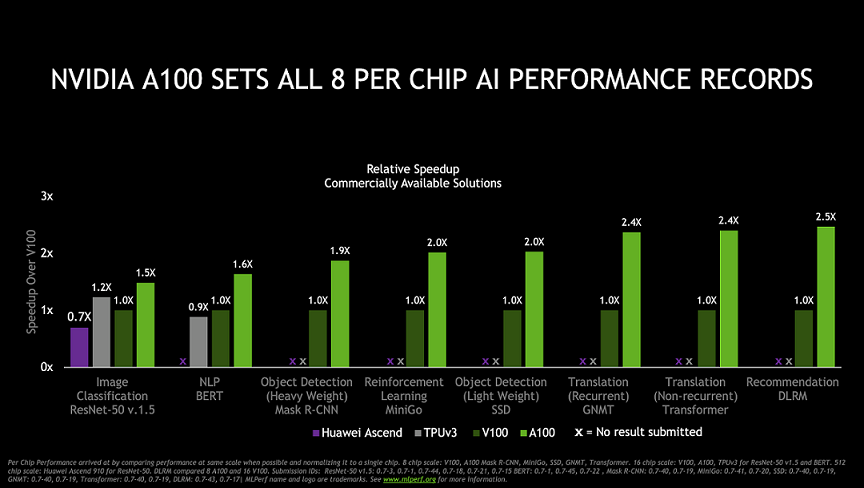 NVIDIA在客户最关心的市售商用产品类别中创下了纪录。NVIDIA在测试中用到的产品基于最新NVIDIA Ampere架构以及Volta架构。