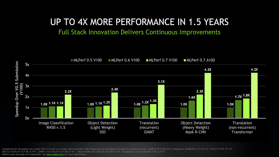 例如,测试结果显示,相较于首轮MLPerf训练测试中使用的基于V100 GPU的系统,如今的DGX A100系统能够以相同的吞吐率,实现高达4倍的性能提升。同时,得益于最新的软件优化,基于NVIDIA V100的DGX-1 系统亦可实现高达2倍的性能提升。