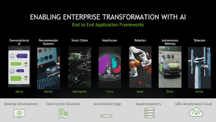 这些应用框架仅仅是一部分。在不断壮大的应用框架中,还有面向汽车行业市场的NVIDIA DRIVE,面向医疗健康市场的Clara,面向机器人技术市场的Isaac,以及面向零售/智能城市市场的Metropolis。