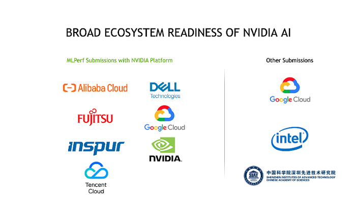 在提交结果的九家公司中,除NVIDIA外还有六家公司提交了基于NVIDIA GPU的测试结果,其中包括三家云服务提供商(阿里云、谷歌云和腾讯云)和三家服务器制造商(戴尔、富士通和浪潮),凸显了NVIDIA生态系统的优势。