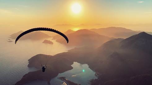 姚舜在土耳其费特希耶的夕阳下飞滑翔伞