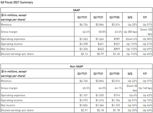 NVIDIA公布了2020第三季季度的财报,在本季度里面录得了创纪录的收入,达到了47.3亿美元,比全年同期30.1亿美元增长了57%,比上一季度的38.7亿美元增长了22%。净利润13.36亿美元,去年同期为8.99亿美元,同比增长49%,上一季度为6.22亿美元,环比增长115%。毛利率62.6%,上一季度是58.8%,而去年同期则是63.6%。