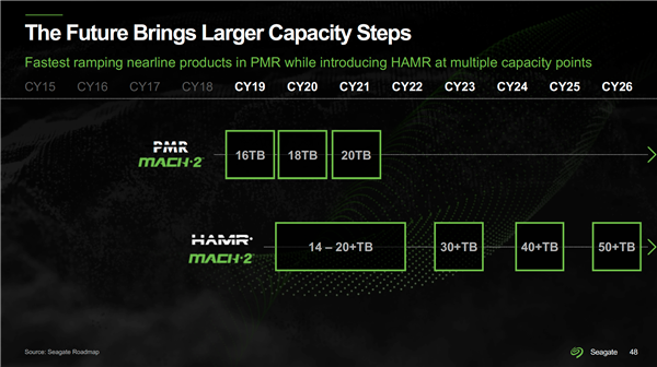 比如希捷研发近20年的HAMR(热辅助磁记录),终于已经开花落地,去年底交付了20TB HAMR硬盘,同时新的多传动器(Muti-Actuator)结构也已经基本成熟,二者结合可让机械硬盘的容量跨上新台阶,2026年达到50TB就靠它们了。类似未来的半导体工艺制程,要想实现更进一步的突破,全新的存储介质、材料是必不可少的。