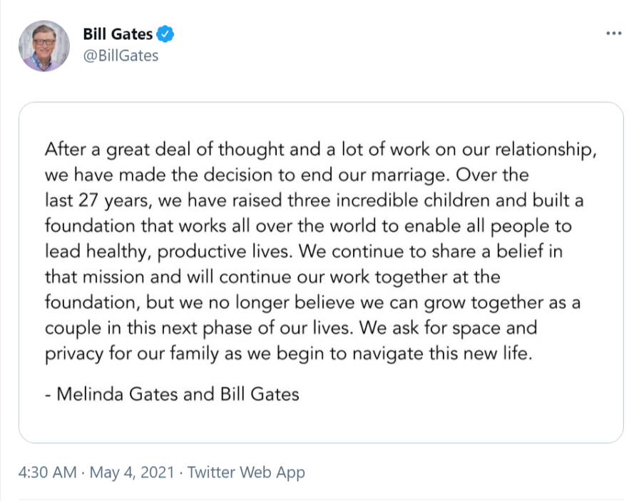 “在经过了许多思考以及对关系的尝试之后,我们作出了结束婚姻的决定。在过去的27年当中,我们抚养了三个孩子,并且建立了一个覆盖全世界,意图让所有人都过上健康充实生活的基金会。我们仍然分享着基于上述信念的使命,并且将继续在基金会当中共同工作,但我们不再相信在生命的下一段还能一起成长。在我们开始这段新的生活时,希望能给予我们的家庭空间和隐私。