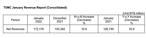根据台积电 2022 年 1 月的官方收入报告,该公司似乎将迎来又一个伟大的一年。与去年 12 月相比,环比收入增长了 10.8%,同比收入增长了 35.8%。以实际货币计算,相当于收入新台币1721.8亿元,约合61.8亿美元,所以这里不谈小土豆。