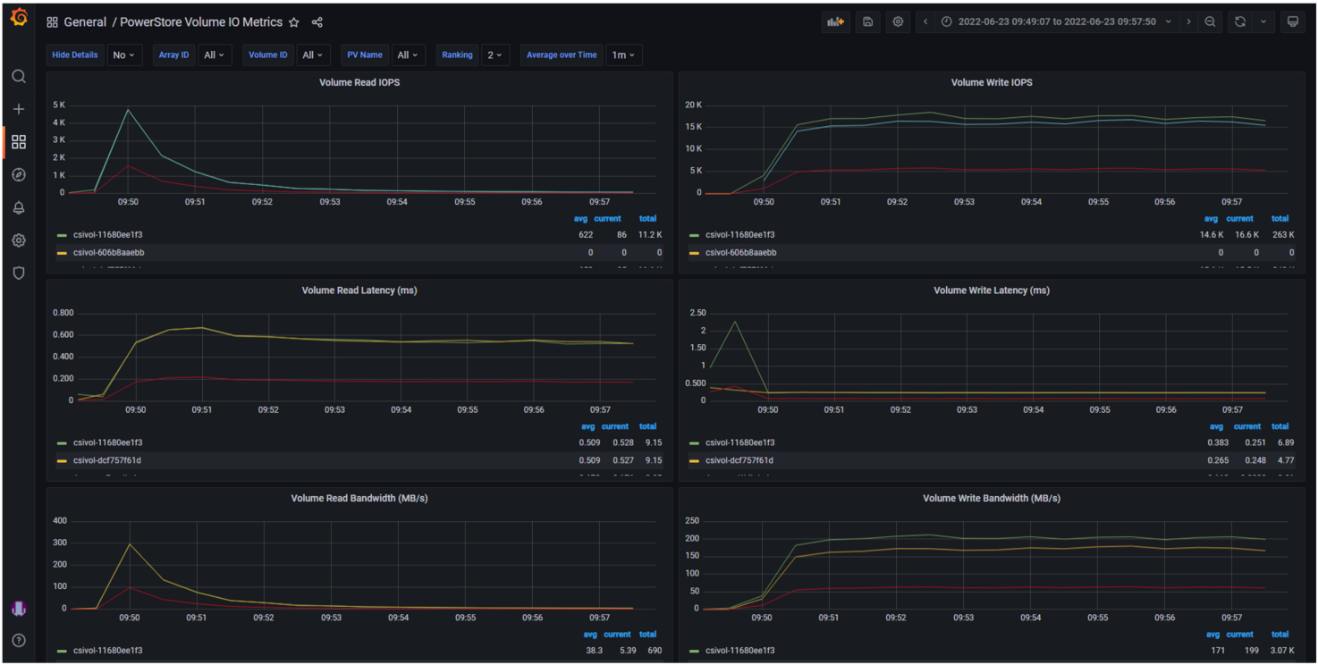 下面的例子显示了PowerStore Volume I/O Metrics仪表板。关键的存储指标(IOPS、延迟和带宽)都按照Dell PowerStore存储设备所报告的信息加以显示。