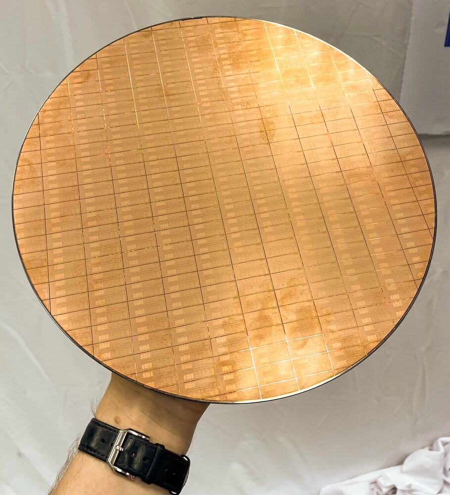 据了解,这块是第13代酷睿顶级型号的晶圆片,8P+16E,也就是24核心版本(i9-13900K/KF),单片面积估计为257 mm²,这片晶圆一共有 231 块,不算良品率问题,这应该能切出231块CPU的核心。