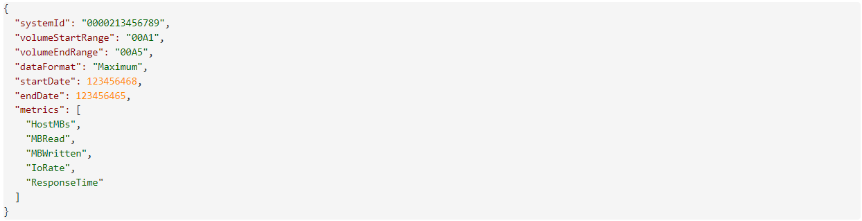 以下是一个调用和有效负载的示例。您可以通过上述的辅助方法,使用卷类别来确定有效类别。与所有性能调用一样,时间戳是以毫秒为单位的EPOCH时间戳。