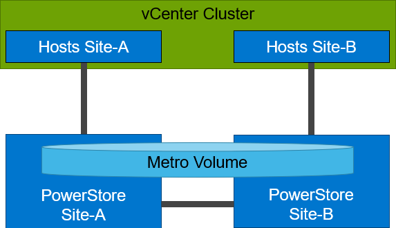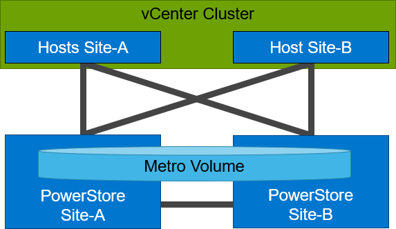 vMSC配置是一个延伸集群架构,ESXi主机可在城域距离[100公里(取决于链路质量)]内的两个不同的站点,同时访问一个同步复制的存储资源。PowerStore城域卷功能可在两个参与的PowerStore集群配置上,提供并发的完全双活的主机IO。