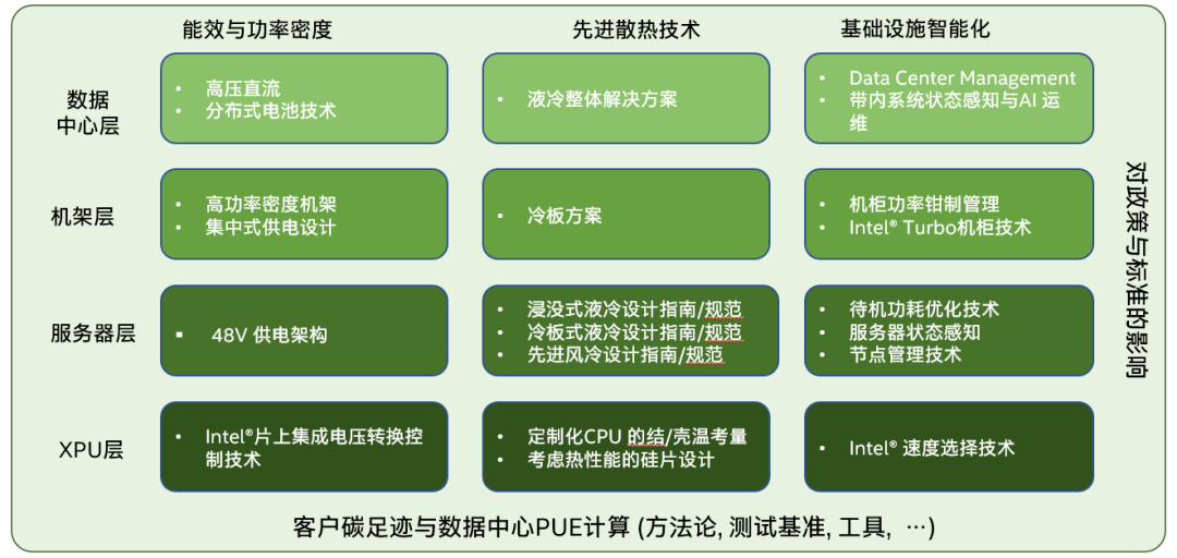 作为可持续发展理念的践行者,以及半导体产业的领军企业,英特尔多方位探索绿色数据中心节能减排技术、工具和方式方法,重点聚焦于能效与功率密度、先进散热技术和基础设施智能化这三个垂直领域,从XPU等器件级到服务器系统、机架和数据中心四个层面,创新推出“四横三纵”矩阵型绿色数据中心技术框架(见图一),为数据中心产业加速节能减碳提供可灵活组合、定制的方案。