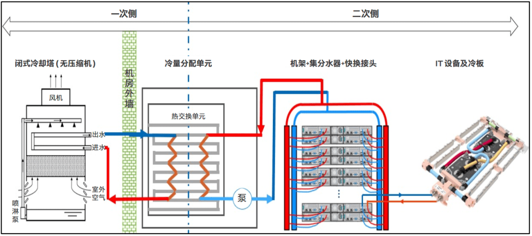 二次侧液体回路是指从冷量分配单元到机架,通过供回冷却工质歧管和IT设备连接,然后再通过歧管返回冷量分配单元的设计。来自二次侧冷却回路的热量通过冷量分配单元的板式热交换器传递到一次侧冷却回路,最终排放到大气中或被热回收再利用。