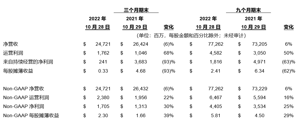 注:截至2022年10月28日的三个月期末与九个月期末数据中,来自持续经营的净利润和每股摊薄收益包含在利息和其它净额中确认的与先前报告的诉讼和解协议相关的10亿美元花费。