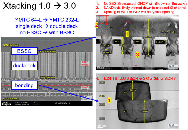 新颗粒采用新的Xtacking 3.0 晶栈架构打造,存储单元晶圆的背面源连接(BSSC),与Xtacking 2.0(最多128层)相比,它带来了更简单的工艺和更低的成本,它引入了硅化镍(NiSi),而不是硅化钨(WSi),以提高CMOS晶圆的器件性能和I/O速度。