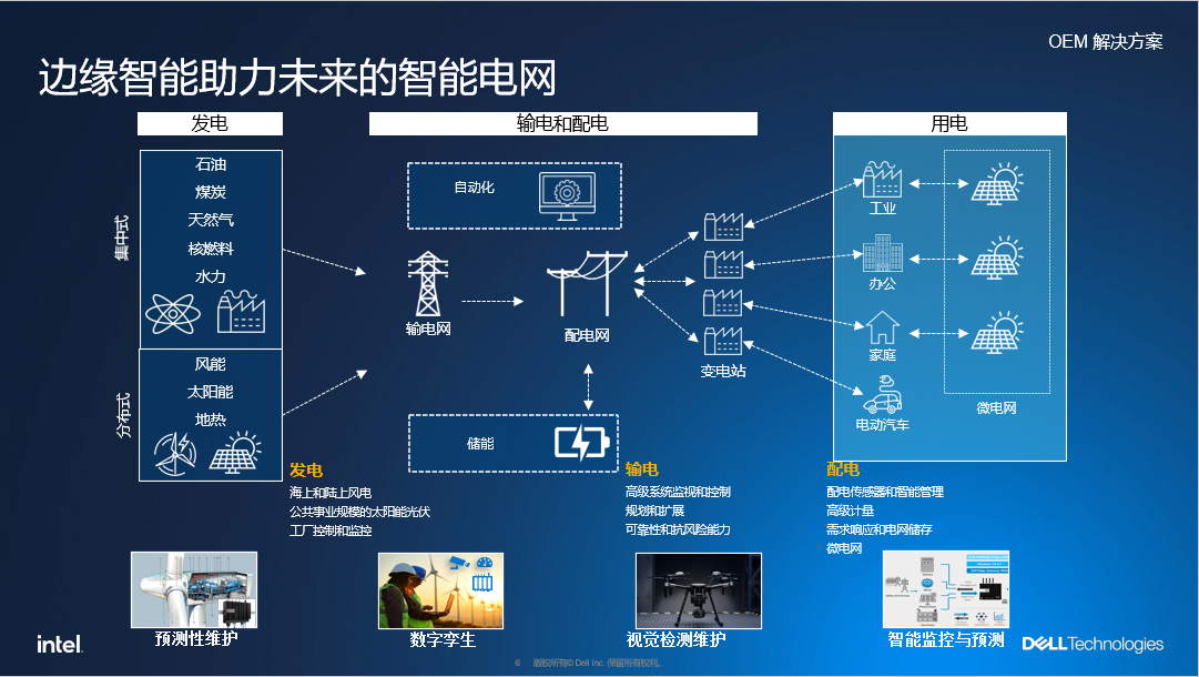 在变电站场景中,电力企业可以在不同环节采用新技术配合巡检,如用无人机进行高压电塔、电缆资源的检测,用巡检机器人模拟人工对固定路线重要装备进行检测。检测过程中产生的图像、温度等信息,可以通过Dell的智能边缘网关向后台传输。一些大型场站也可以部署智能的边缘计算节点,配合仿真监控、能源存储监控,形成智能调度。