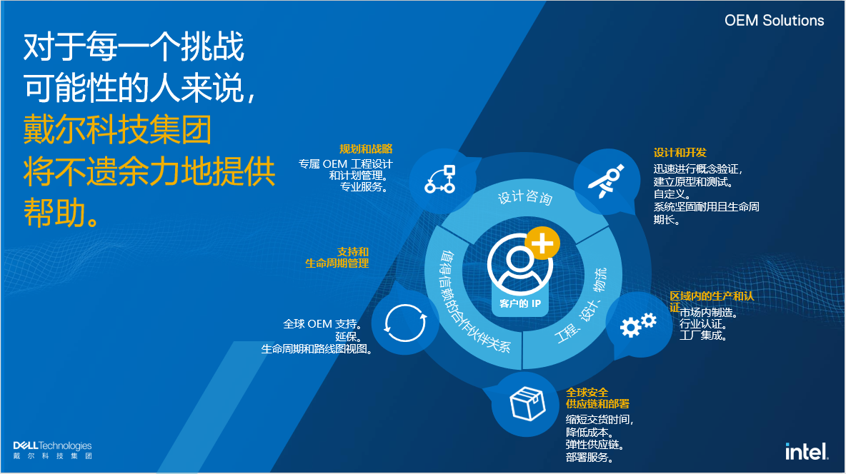 戴尔科技集团大中华区OEM业务总经理冯伟指出:经过20多年的发展,戴尔科技集团OEM业务已经积累了非常多的客户,全球财富100强中,很多都是戴尔OEM的客户。戴尔OEM 解决方案可以针对具体环境及使用情况进行定制化改造,包括为独特设计而构建、为实现智能成果设计、为各种环境设计的解决方案。