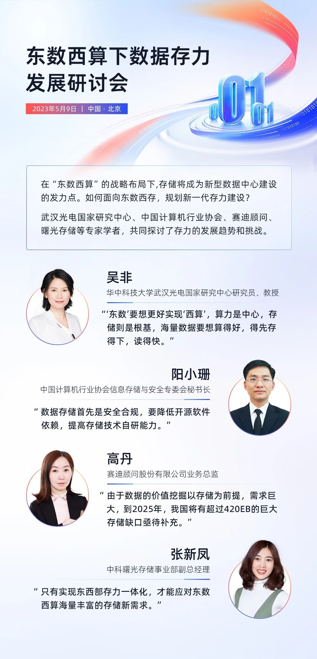 5月9日,“东数西算下数据存力发展研讨会”在京成功举办,来自武汉光电国家研究中心、中国计算机行业协会、赛迪顾问、曙光存储的多位专家共话存力发展。会上,华中科技大学武汉光电国家研究中心的吴非教授提出:“‘东数’要想更好实现‘西算’,算力是中心,存储则是根基,海量数据要想算得好,得先存得下,读得快。”数据是算力的基石,算力依赖存力,因此“东数西算”的实质更多地表现为“东数西存”。