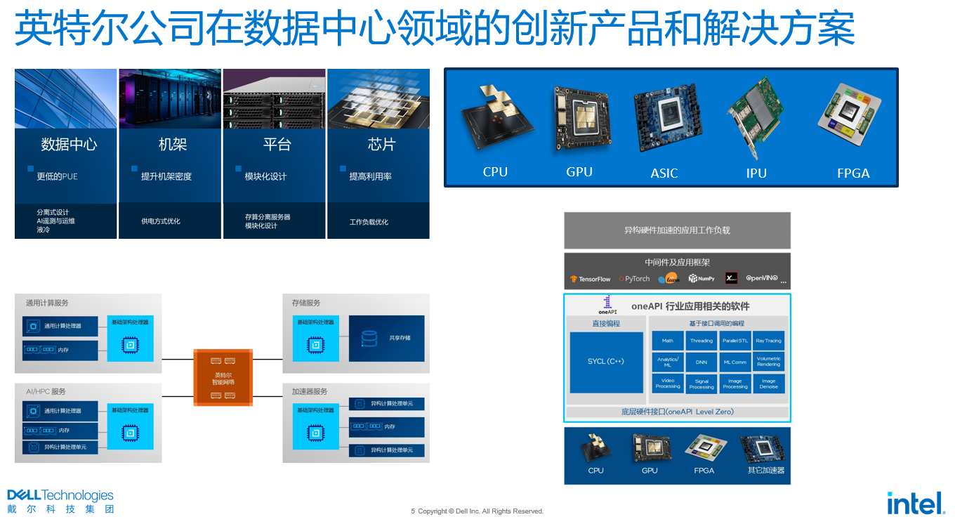 "英特尔在数据中心领域里有着长久的技术积累。"胡明月表示,在数据中心、机架、平台和芯片层面,英特尔能够提供全方位的数据中心创新性解决方案,涵盖针对液冷的冷板和浸没式主板和服务器设计、机架级共用电源解决方案、模块化服务器设计、芯片新型封装和高速互连、芯片上的工作负载加速器、IPU、GPU、FPGA、ASIC、NIC、各种规格和型号的CPU和软件。此外,英特尔还会联合广泛的生态链合作伙伴,如戴尔公司,为客户新一代数据中心解决方案的落地提供强有力的支持。