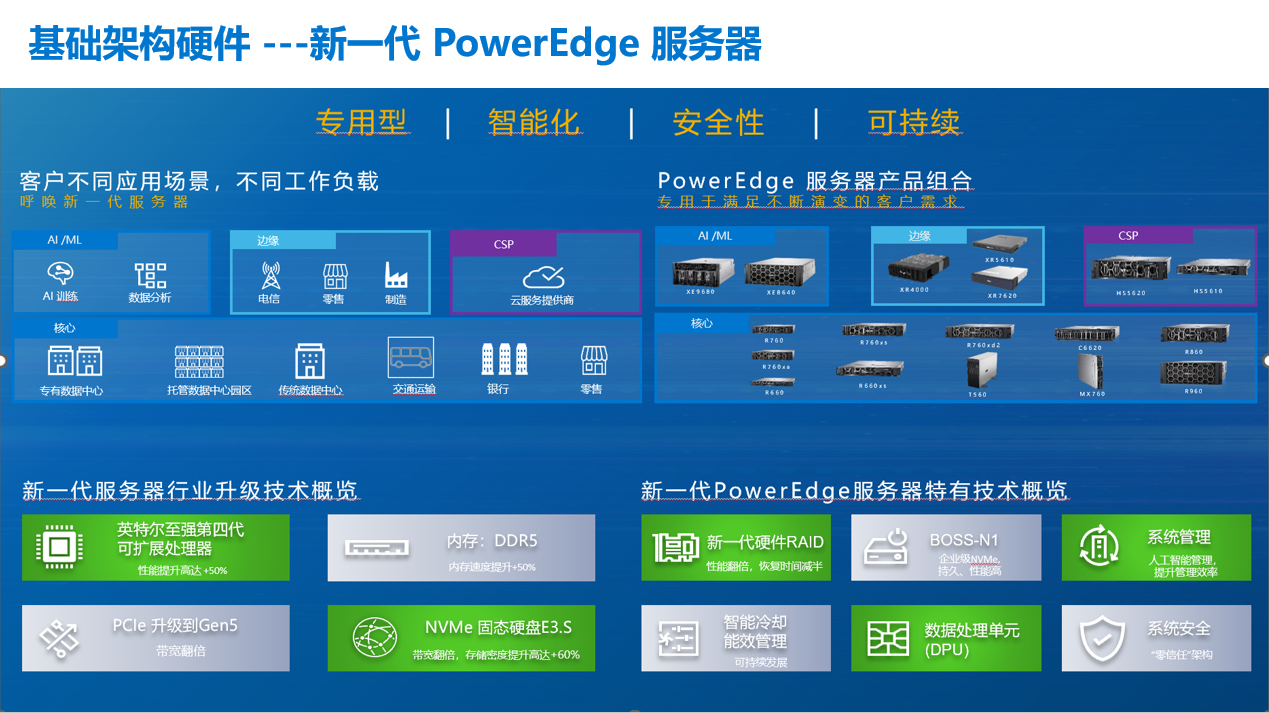 一、高性能。PowerEdge服务器采用了英特尔至强第四代可扩展处理器,性能比过去提升了50%;内存采用了DDR5技术,内存速度也提升了50%;PCIe升级到第五代,带宽实现了翻倍;NVMe固态硬盘E3.S则使存储密度提升了60%。