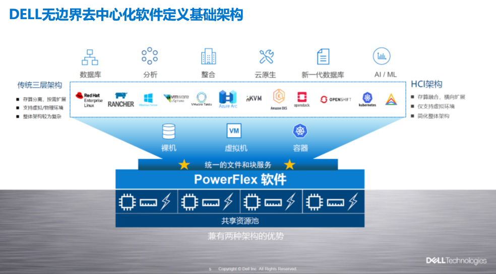 传统的三层架构支持存算分离、按需扩展、支持虚拟环境和物理环境,但是整体架构较为复杂,HCI架构则支持存算融合、横向扩展,支持虚拟环境,整体架构简化。戴尔PowerFlex软件在计算环境中可以支持裸机、虚拟机和容器,在数据服务中可以提供统一的文件和块服务,构建完整的数据服务,变成一个共享的资源池。