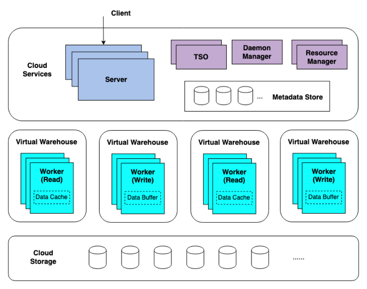 为了让大家更好的理解需要部署的组件,这里简单介绍下ByConity的架构。想更深入了解请参考另一篇文章《谈谈ByConity存储计算分离架构和优势》(https://mp.weixin.qq.com/s/FNaC3RTr7BxBZbditTJxRw)。ByConity的存储计算分离架构主要分为三层:共享服务层、计算层和云存储层。共享服务层是所有查询的入口,主要组件是Cloud Service和Metadata Storage,它会对查询进行解析和优化,并负责一些服务、组件和事务的管理和元数据的管理。计算层是计算资源组,主要组件是Virtual Warehouse(VW),包括Read VW和Writer VW。云存储层是分布式统一存储系统,ByConity所有的数据都存储在这一层,在计算层进行查询时,会从云存储层中读取数据,具体实现可以采用各种云存储服务,如HDFS、S3等。此外,ByConity还包括TSO、Daemon Manager、Resource Manager、后台任务和服务发现等共享服务组件,为整个系统提供稳定的支持和管理。