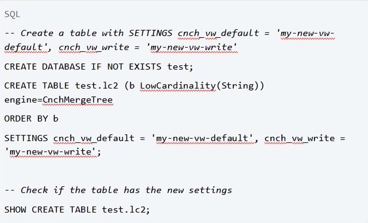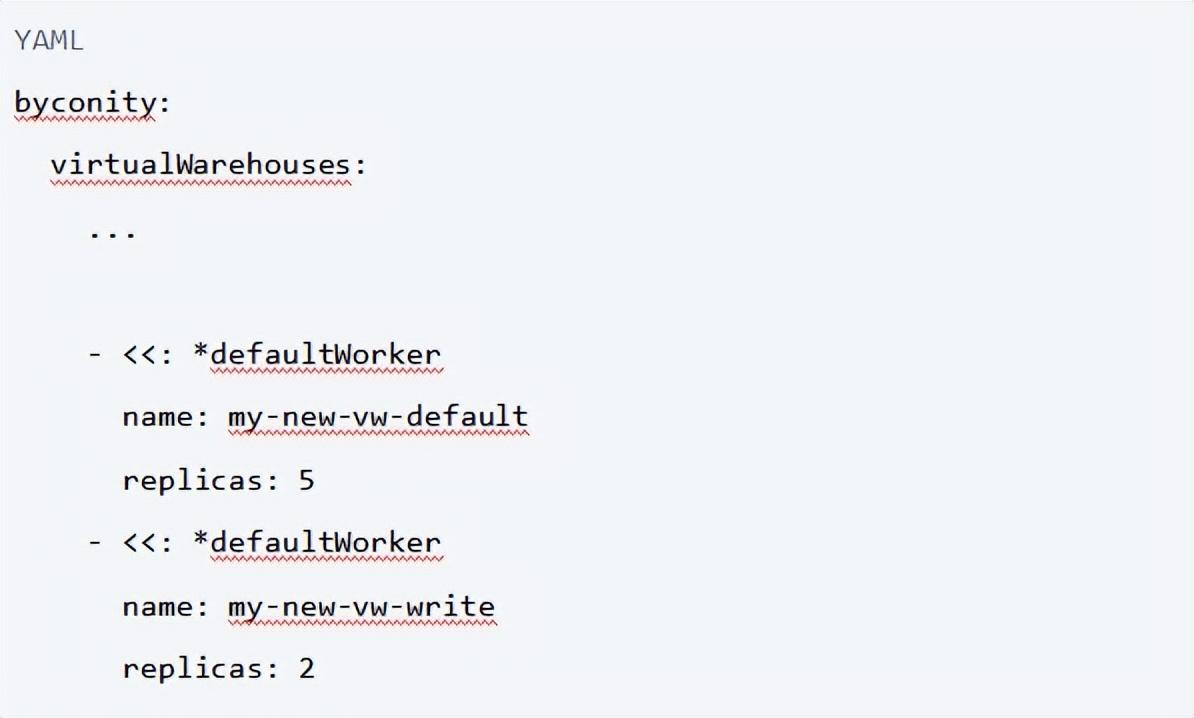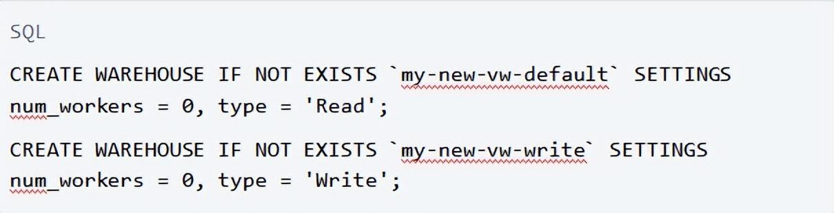 这里举例说明如何增加新的计算组(Virtual Warehouse),假如用户希望增加两个计算组,5个副本用户读取(my-new-vw-default )2个副本用户写入(my-new-vw-write )。