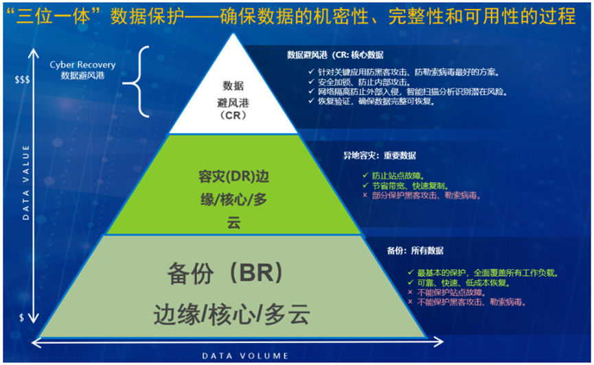 戴尔帮助企业提高网络弹性的方式,是通过帮助企业打造“三位一体”,即数据备份(BR)+灾难恢复(DR)+数据避风港(CR)的保护架构,从而构建起数据保护的闭环策略。在“三位一体”保护架构协助企业用户将所有的数据做好备份,对重要数据做好容灾,而最核心的数据要交于“数据避风港”,确保数据不被污染,不被篡改,以便企业在网络攻击中断其运营之前还原数据和恢复正常运营。