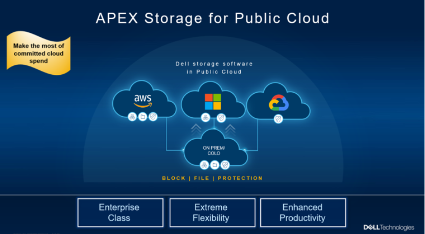 最新的Dell APEX即服务中提供了APEX Storage for Public Cloud,即将戴尔成熟的存储软件放到公有云上来运行,不仅能提供丰富的企业级特性和安全性,无缝的数据移动性,以及强大的性能和扩展性。其中,块存储服务支持AWS和微软Azure 上运行,而文件存储支持在AWS上运行。